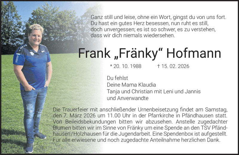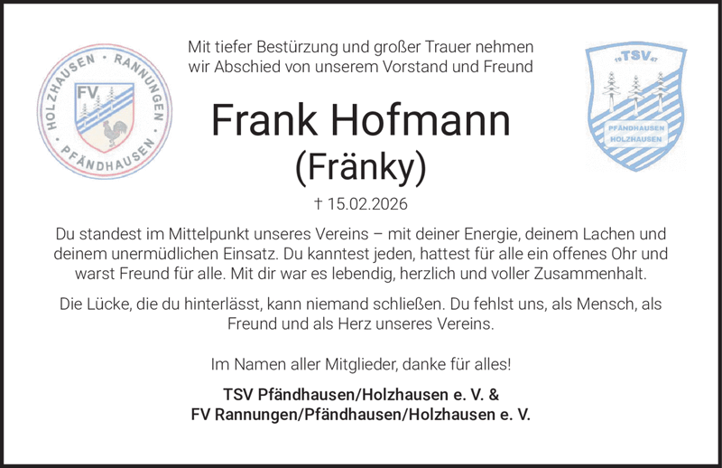 Der FV Rannungen/Pfändhausen/Holzhausen e. V. trauert um seinen langjährigen 1. Vorsitzenden Frank Hofmann, der am 15. Februar 2026 im Alter von nur 37 Jahren verstarb.